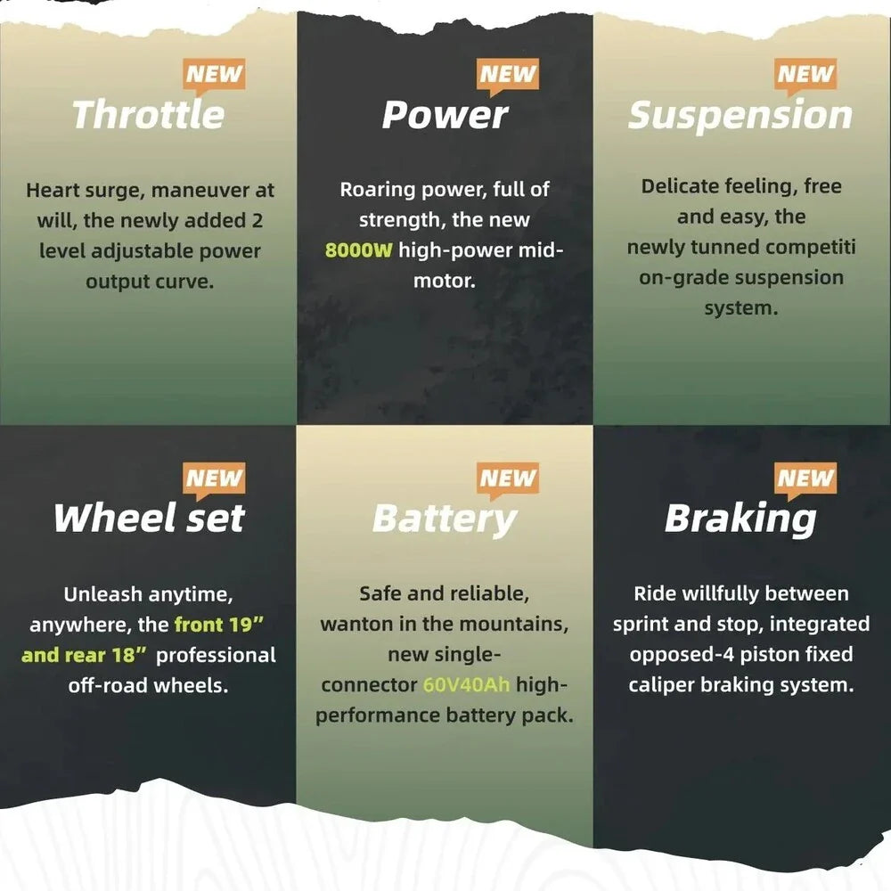 The cutting-edge PMSM motor combined with the state-of-the-art FOC Sinewave Controller delivers an exhilarating 8000 watts of power and a remarkable 196.2 ft-lbs of torque directly to the wheel, guaranteeing exceptional performance on all terrains.